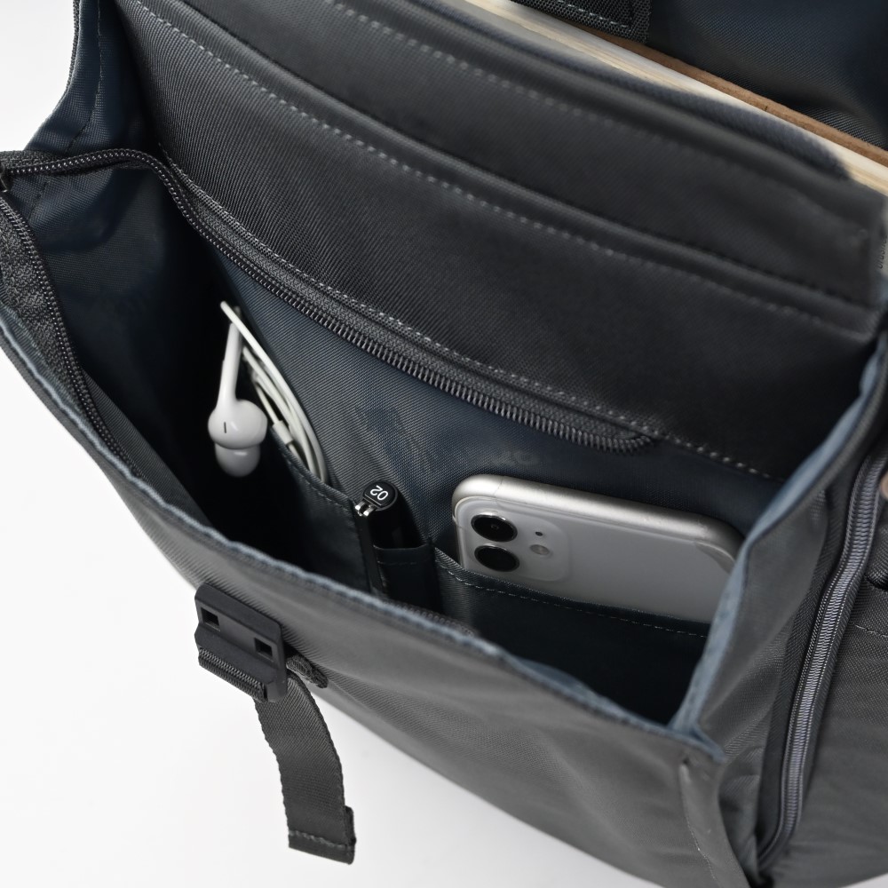 - Ngăn mặt trước gồm 1 ngăn có khoá kéo và mở rộng để đựng bóp ví, điện thoại, dắt viết và danh thiếp...