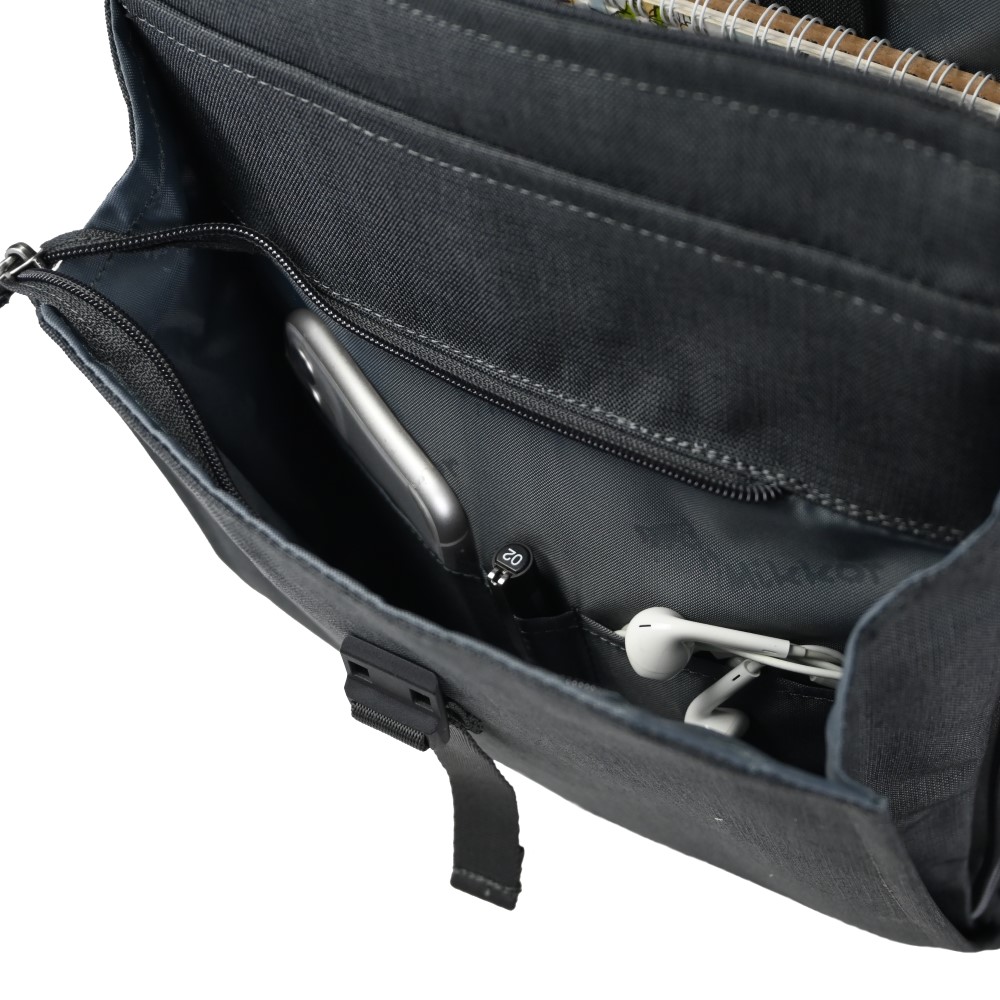 - Ngăn mặt trước gồm 1 ngăn có khoá kéo và mở rộng để đựng bóp ví, điện thoại, dắt viết và danh thiếp...