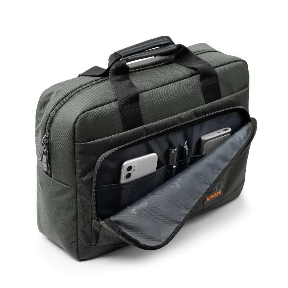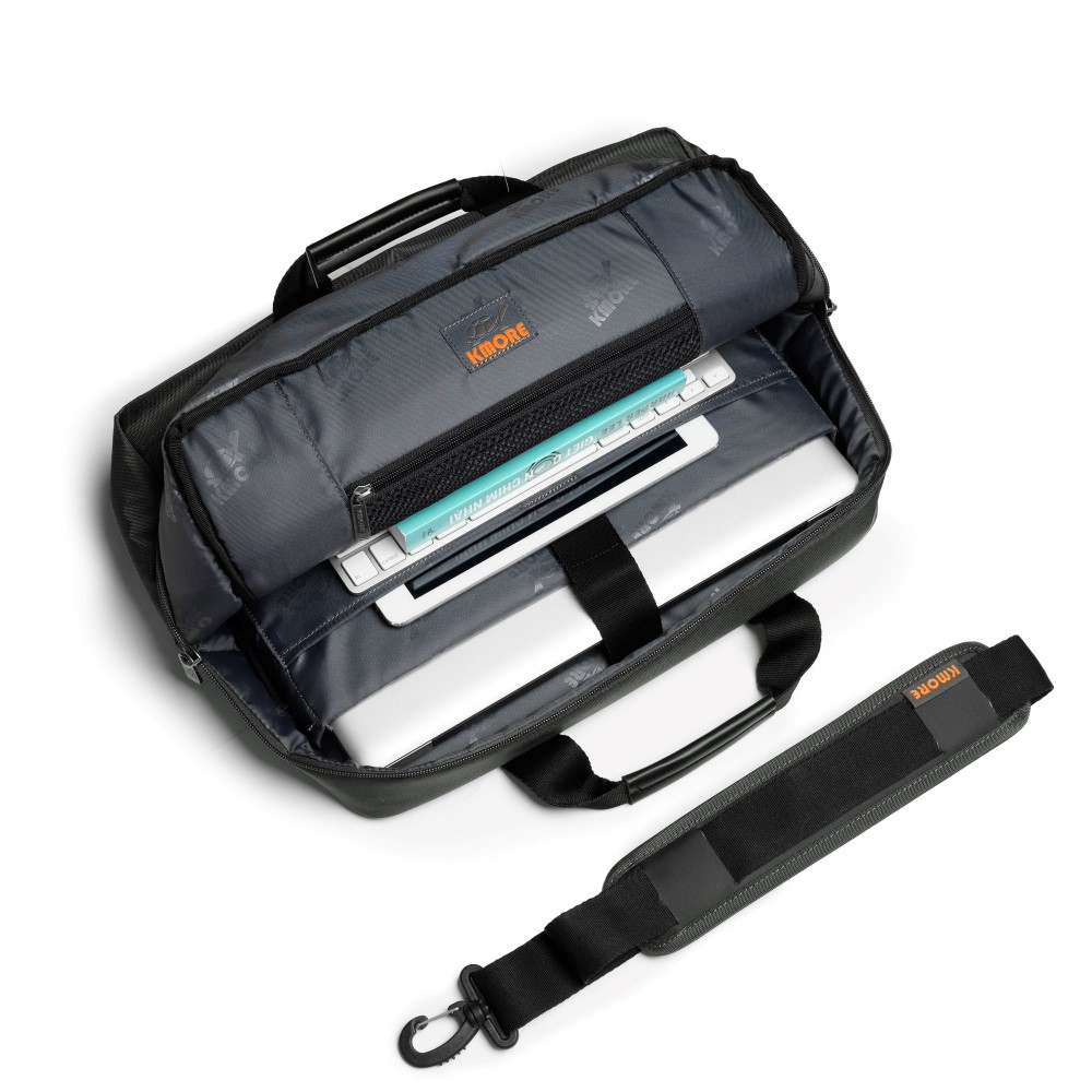 - Cặp Laptop Kmore The Brooks Briefcase với 3 màu chủ đạo Black, Navy, Tan được thiết kế đặc sắc trên nền vải 900D Twill Polyester with PU&WR, PU/2T, chống thấm, bền màu cùng logo thương hiệu Kmore độc đáo.