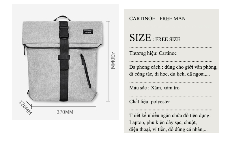 - Balo laptop Cartinoe Freeman thiết kế với phong cách mạnh mẽ, thời trang, nhiều ngăn tiện dụng phù hợp học sinh, sinh viên, nhân viên văn phòng...