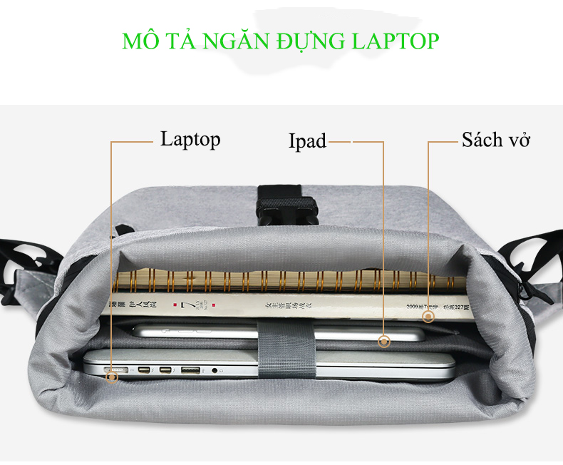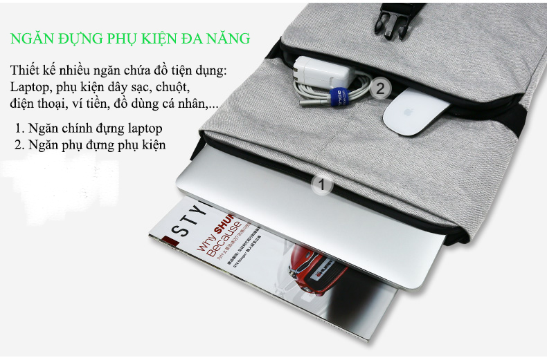 - Ngăn chính rộng rãi, bên trong có ngăn để laptop 15 inch, ngăn để máy tính bảng, hồ sơ và nhiều ngăn nhỏ tiện dụng khác.