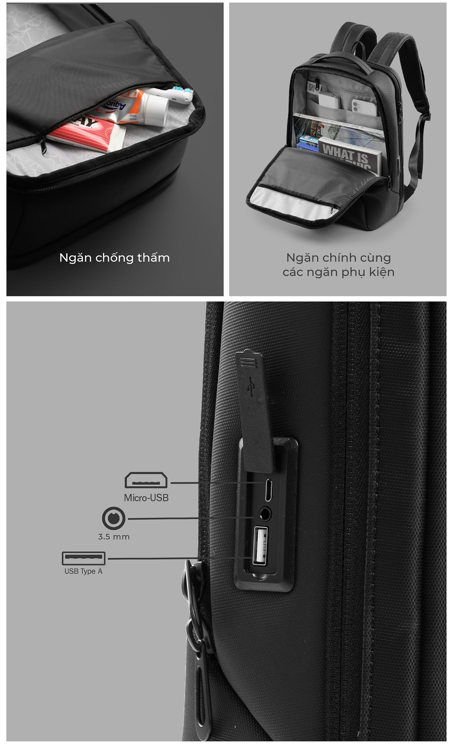 - Đặc biệt có trang bị các loại cổng sạc USB bên hông balo.