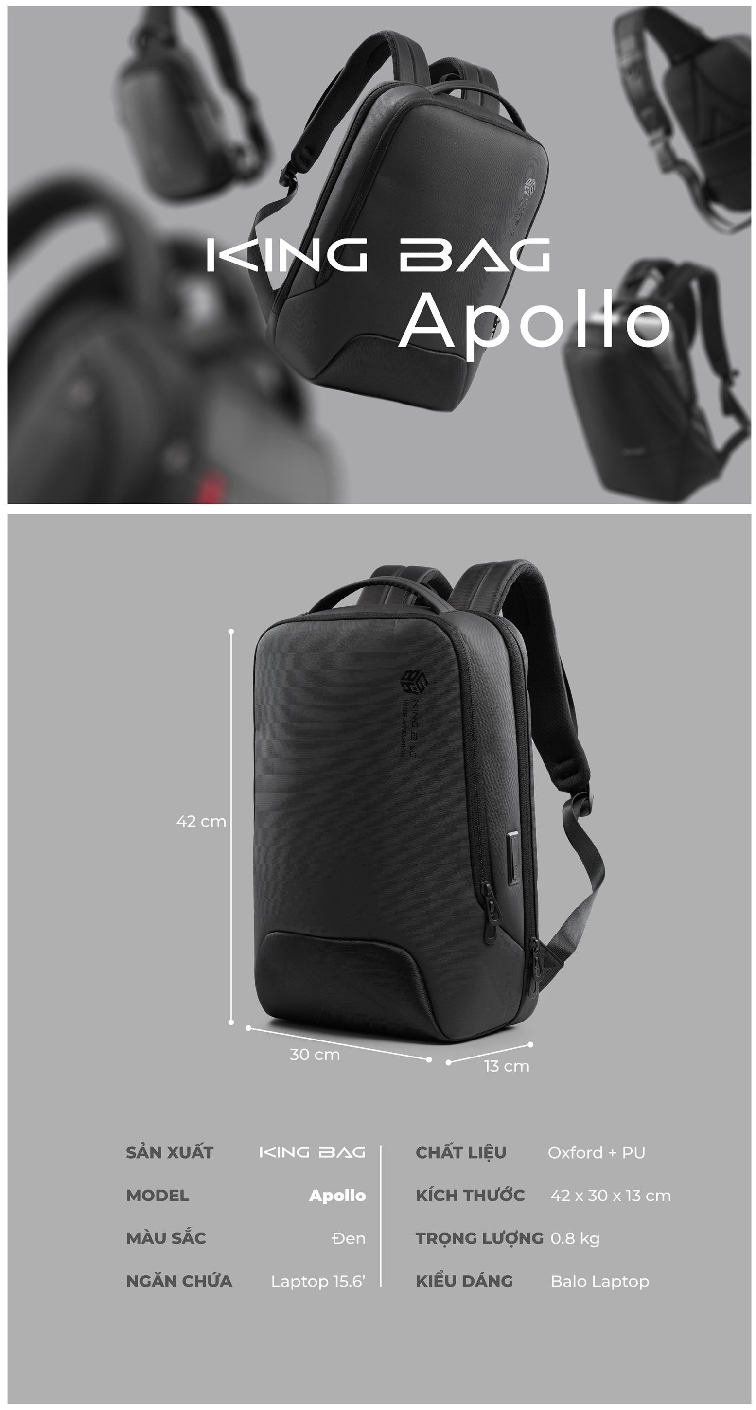 - Balo laptop Kingbag Apollo với kiểu dáng sang trọng, thời trang mang phong cách Italy. Các ngăn được thiết kế khoa học tiện dụng phù hợp mang đi làm hay đi du lịch.