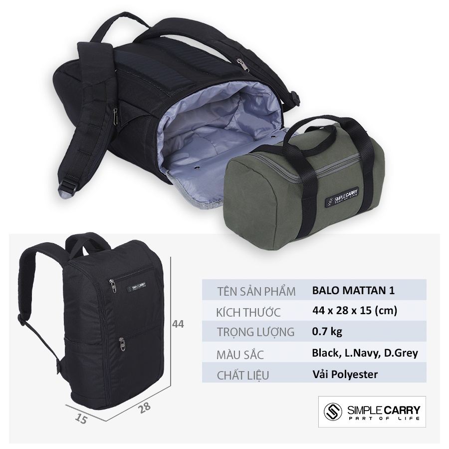 - Balo Simplecarry Mattan 1 gồm 1 ngăn chính, bên trong có ngăn laptop 15.6 inch, ngăn lưới để phụ kiện.