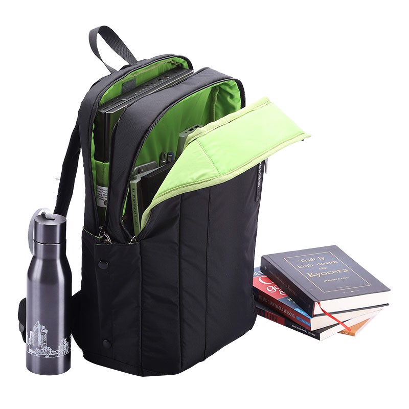 - Ngăn trong: có ngăn để bút viết, sạc, điện thoại... ngăn đựng laptop 15.6 inch với lớp PE chống sốc.