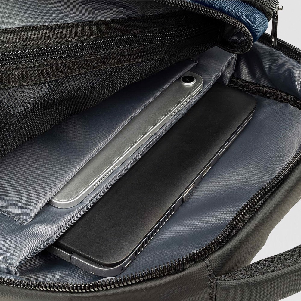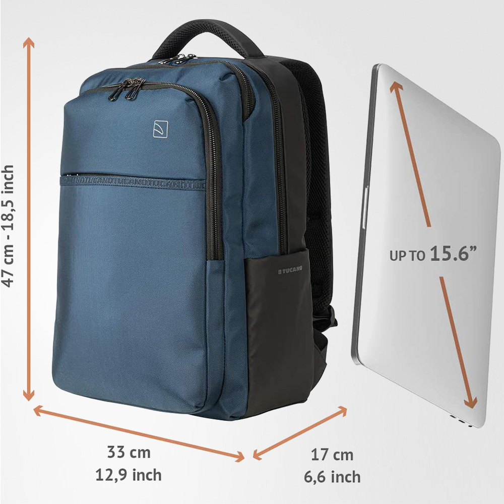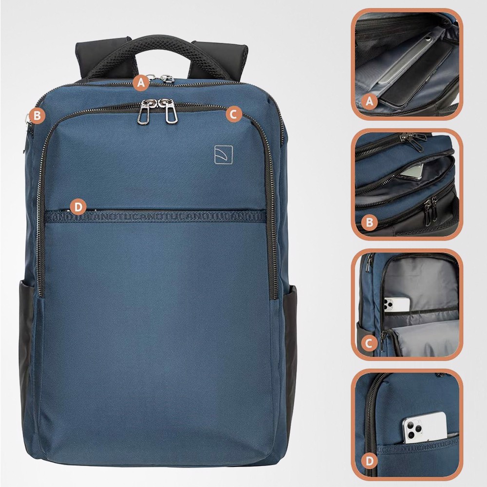 - Tucano Martem Navy có thiết kế gồm: 3 ngăn lớn và nhiều chi tiết ngăn phụ. Ngăn chính có ngăn laptop được trang bị hệ thống chống sốc, chống trượt, balo an toàn dành cho thiết bị Macbook Pro lên đến 16” hoặc laptop 15.6''.