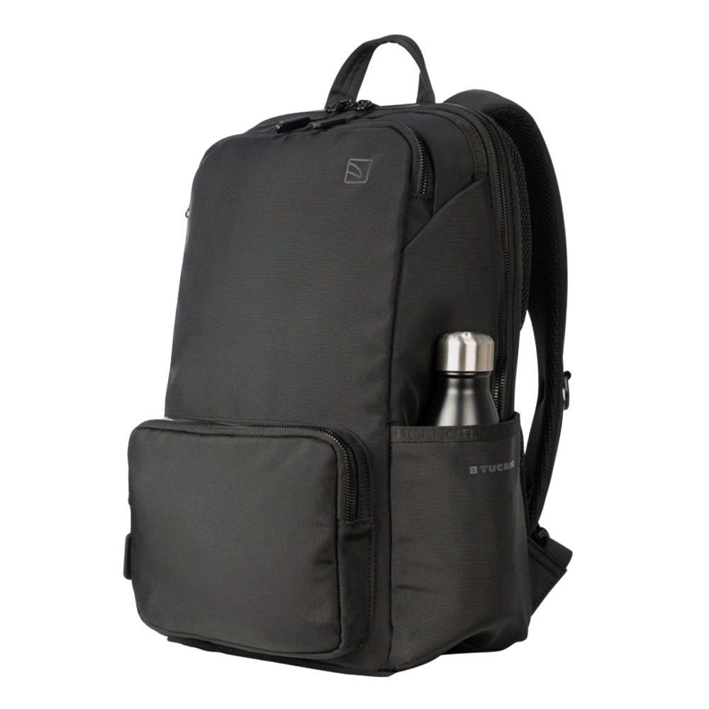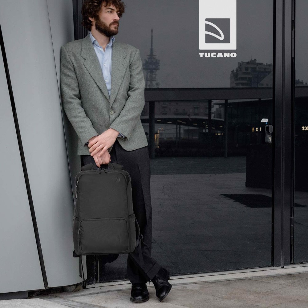 - Balo Tucano Terra Gravity sử dụng chất liệu vải 600D Nylon (sợi polyester) cực dày, bền bỉ, kháng nước tốt. Hai ngăn chống sốc bên trong dành cho laptop 15.6” và tablet.