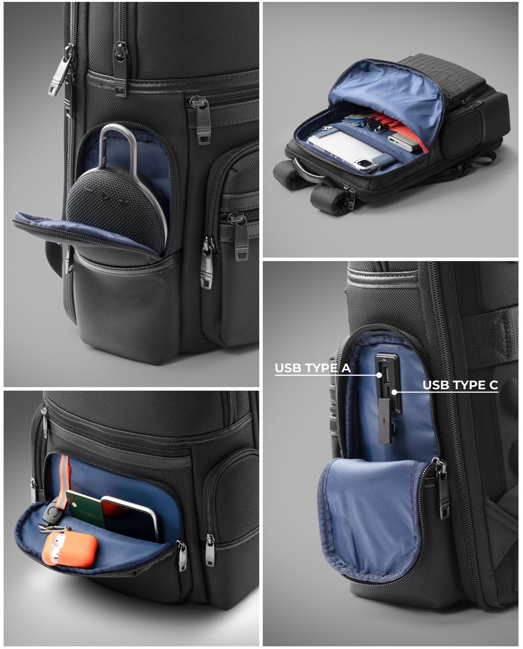 - Hai bên hông balo có cổng sạc USB và ngăn túi để bình nước.