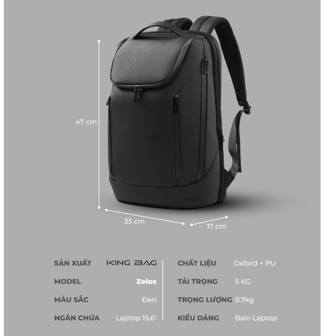 - Balo laptop Kingbag Zelos với kiểu dáng sang trọng, thời trang mang phong cách Italy. Các ngăn được thiết kế khoa học tiện dụng phù hợp mang đi làm hay đi du lịch.