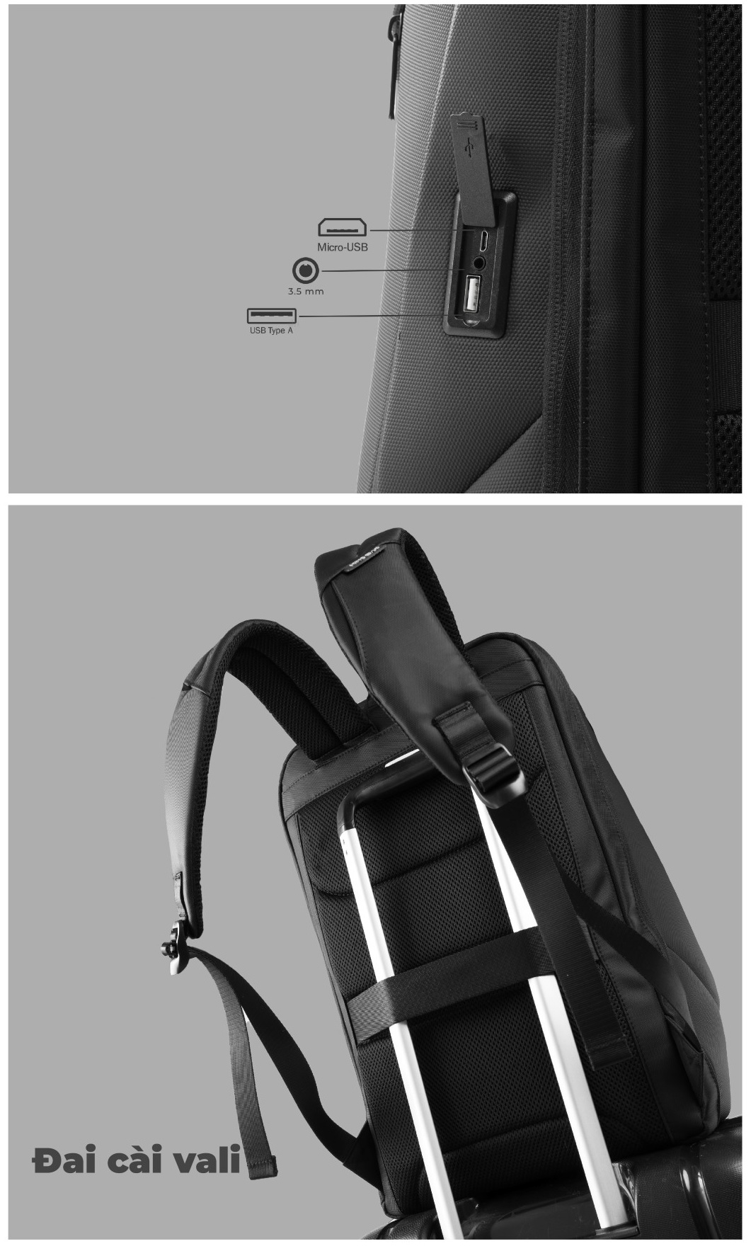 - Đặc biệt có trang bị các loại cổng sạc USB bên hông balo.