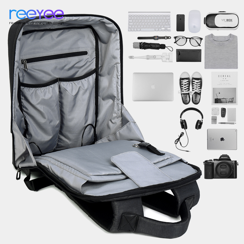 - Balo Reeyee gồm 1 ngăn chính lớn, bên trong có ngăn để laptop 15.6 inch, ipad - tablet và các ngăn nhỏ để phụ kiện. Phía trước có đến 4 ngăn khác nhau có thể để bút viết, sạc, điện thoại, chìa khóa...