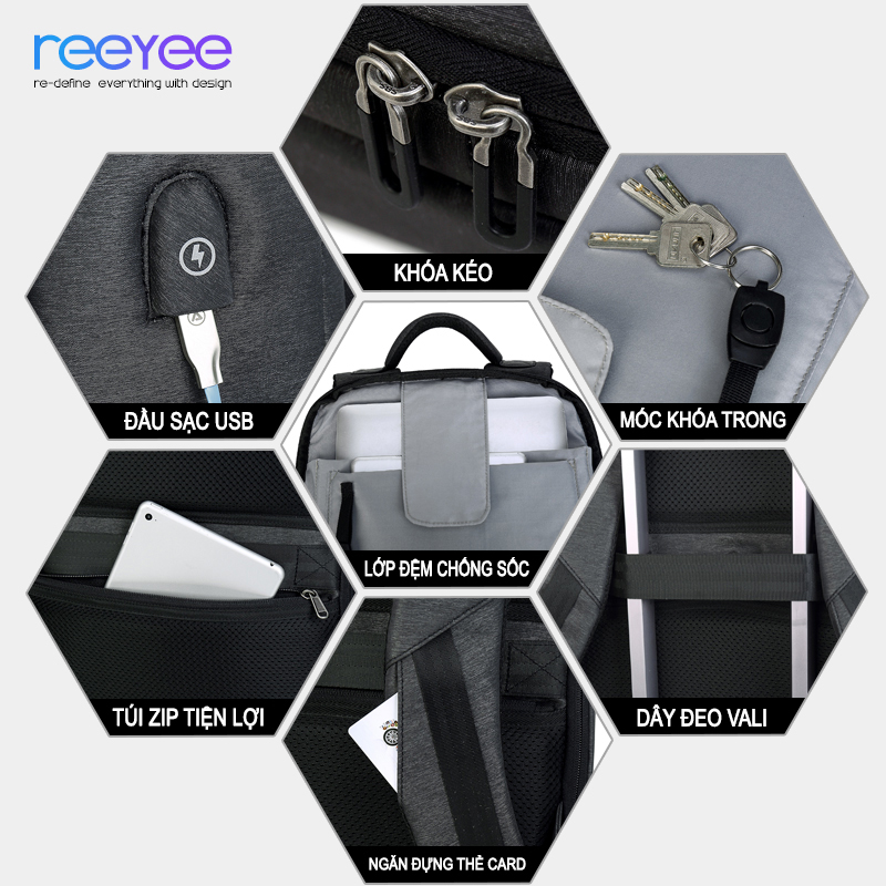 - Balo laptop Reeyee RY1035 gồm rất nhiều ngăn tiện lợi được sắp xếp khoa học mang đến trải nghiệm hoàn toàn mới với thiết kế đậm chất thời trang, cá tính cùng khả năng lưu trữ hoàn hảo.
