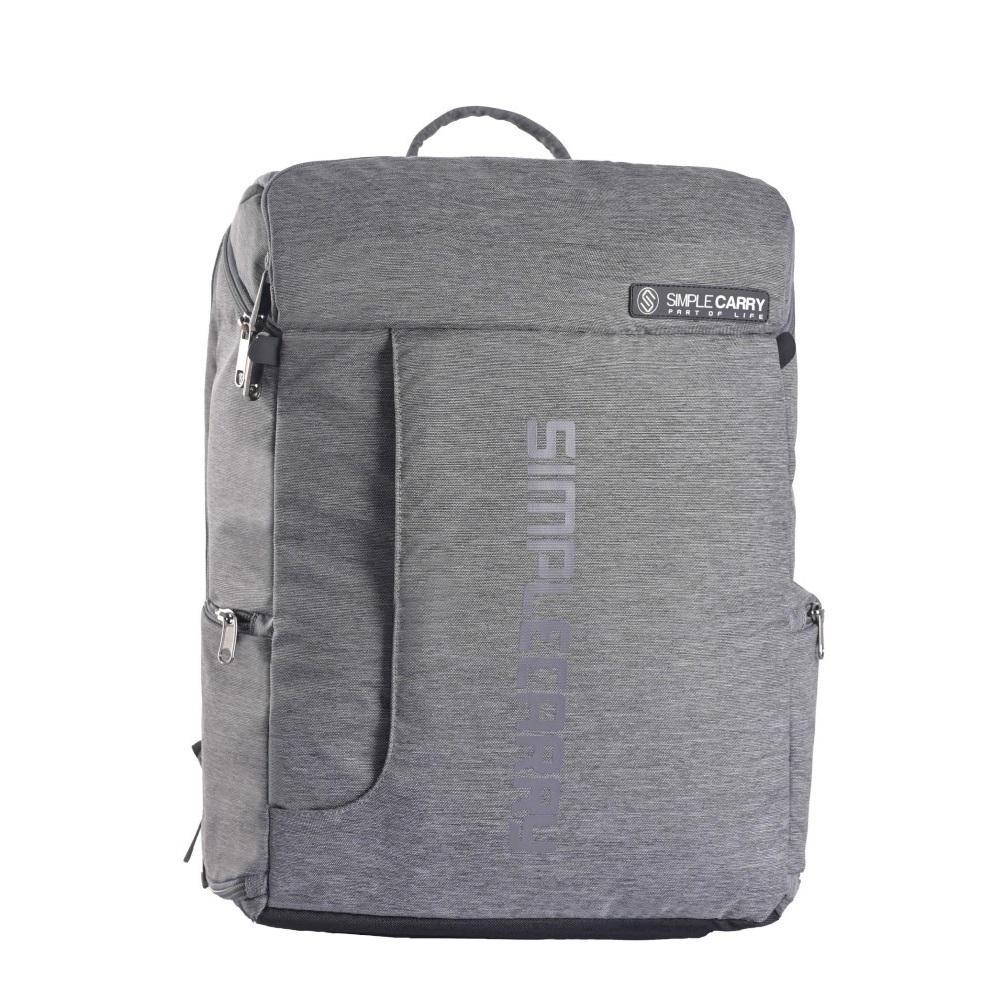 - Ngoài ra còn có 2 ngăn phụ mặt trước, phía trước và bên trên của ba lô đính logo thương hiệu SimpleCarry. Bên hông là ngăn đựng nước.