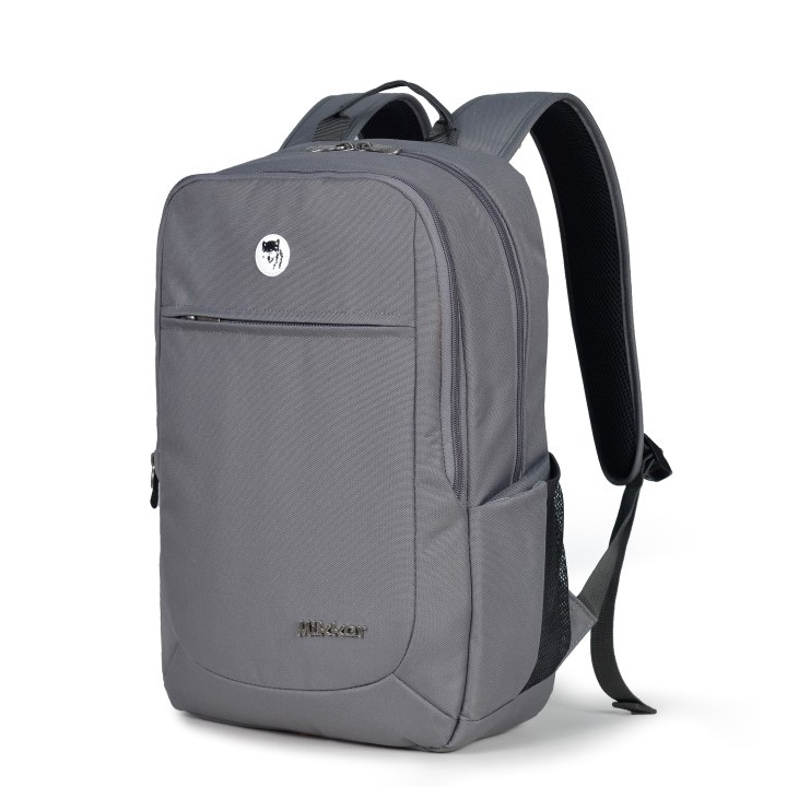 - Mặt trước balo đính logo chú sói biểu tượng thương hiệu và logo hợp kim MIKKOR nổi bật.