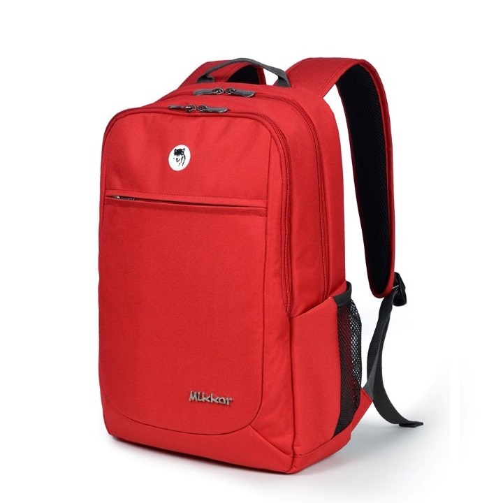 - Mặt trước balo đính logo chú sói biểu tượng thương hiệu và logo hợp kim MIKKOR nổi bật.