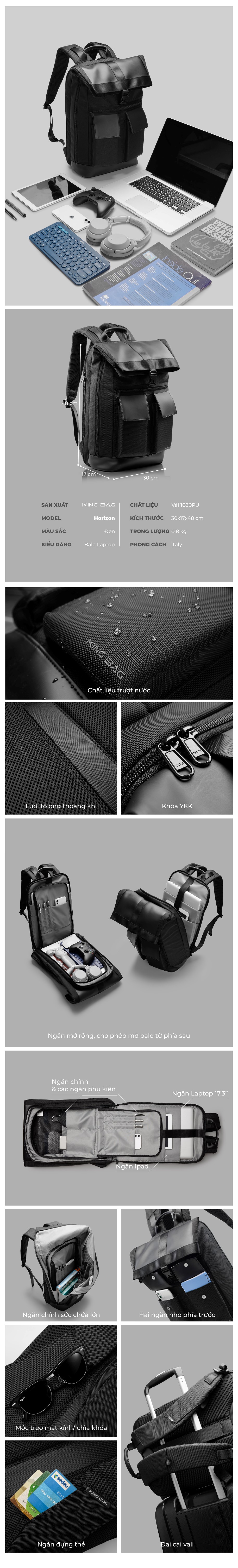 - Balo laptop Kingbag Horizon với kiểu dáng sang trọng, thời trang mang phong cách Italy. Các ngăn được thiết kế khoa học tiện dụng phù hợp mang đi làm hay đi du lịch.
