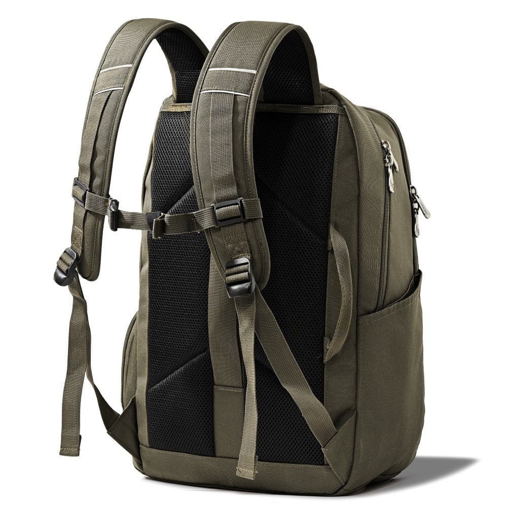 - Thân sau và quai đeo với mút dày và êm trên nền Airmesh thoáng nhiệt. Quai đeo êm, có khoá trợ lực ngực hỗ trợ khi di chuyển. Bên cạnh đó, quai đeo còn có thể tăng giảm độ dài, tiện lợi để bạn điều chỉnh phù hợp với chiều cao của mình. Quai xách đỉnh được thiết kế hài hoà, nâng đều chiếc balo khi bạn xách.