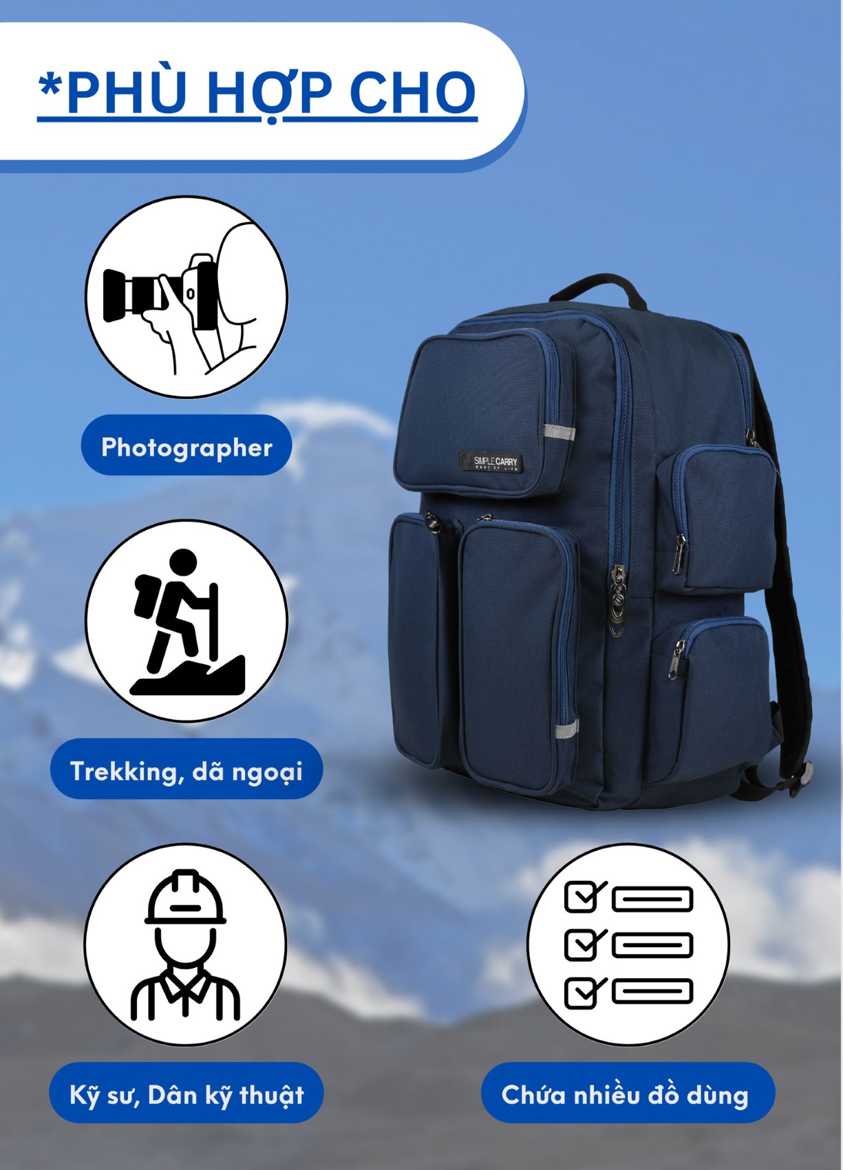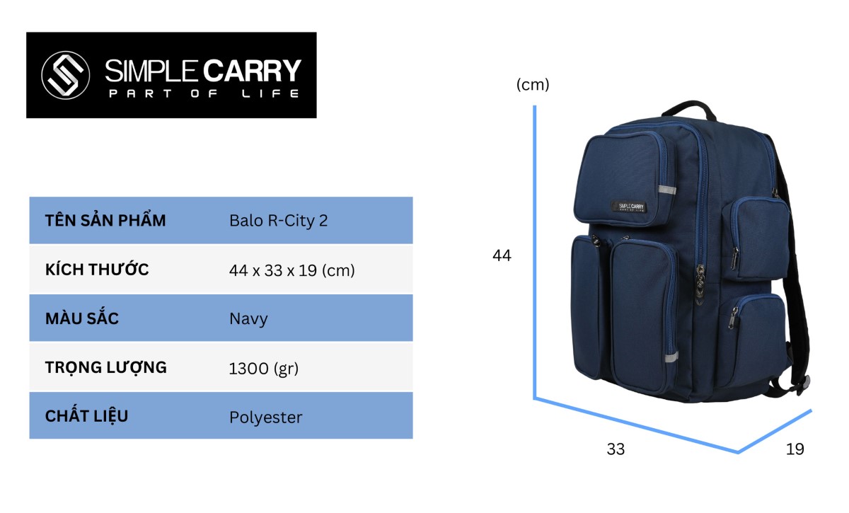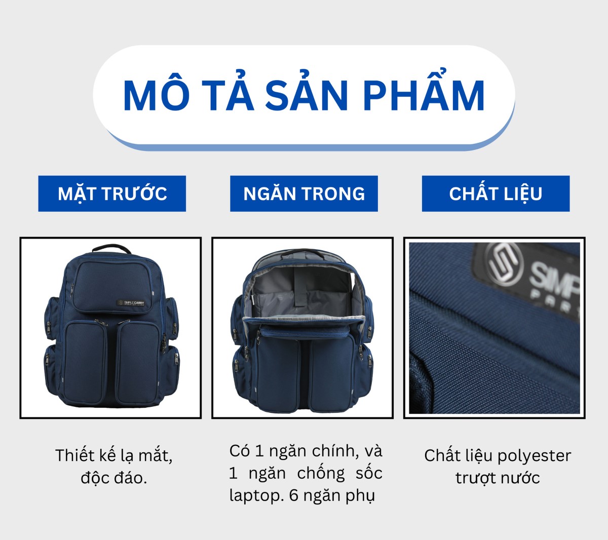 - Mặt trước có 3 ngăn phụ thêu tên sản phẩm, đính logo thương hiệu Simplecarry.