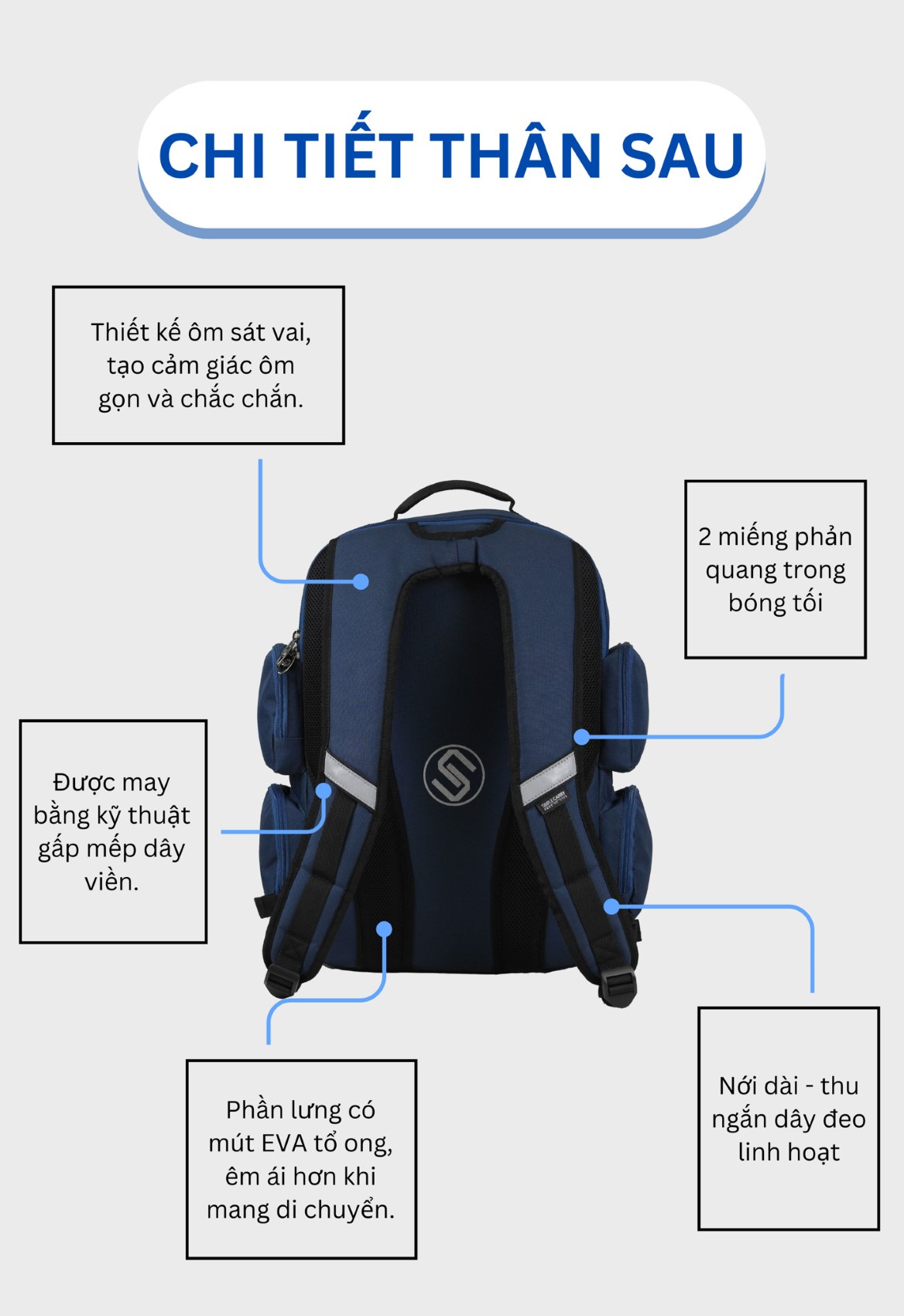 - Quai đeo: Được may bằng kỹ thuật gấp mép dây viền, thiết kế ôm rất sát hai vai, chắc chắn, việc nới dài – thu ngắn dây đeo vô cùng linh hoạt, quai xách được may phía trên quai đeo. Thêu tên thương hiệu trên quai đeo, cách điệu với simili và vải phản quang trên 2 quai đeo, an toàn khi di chuyển trong đêm