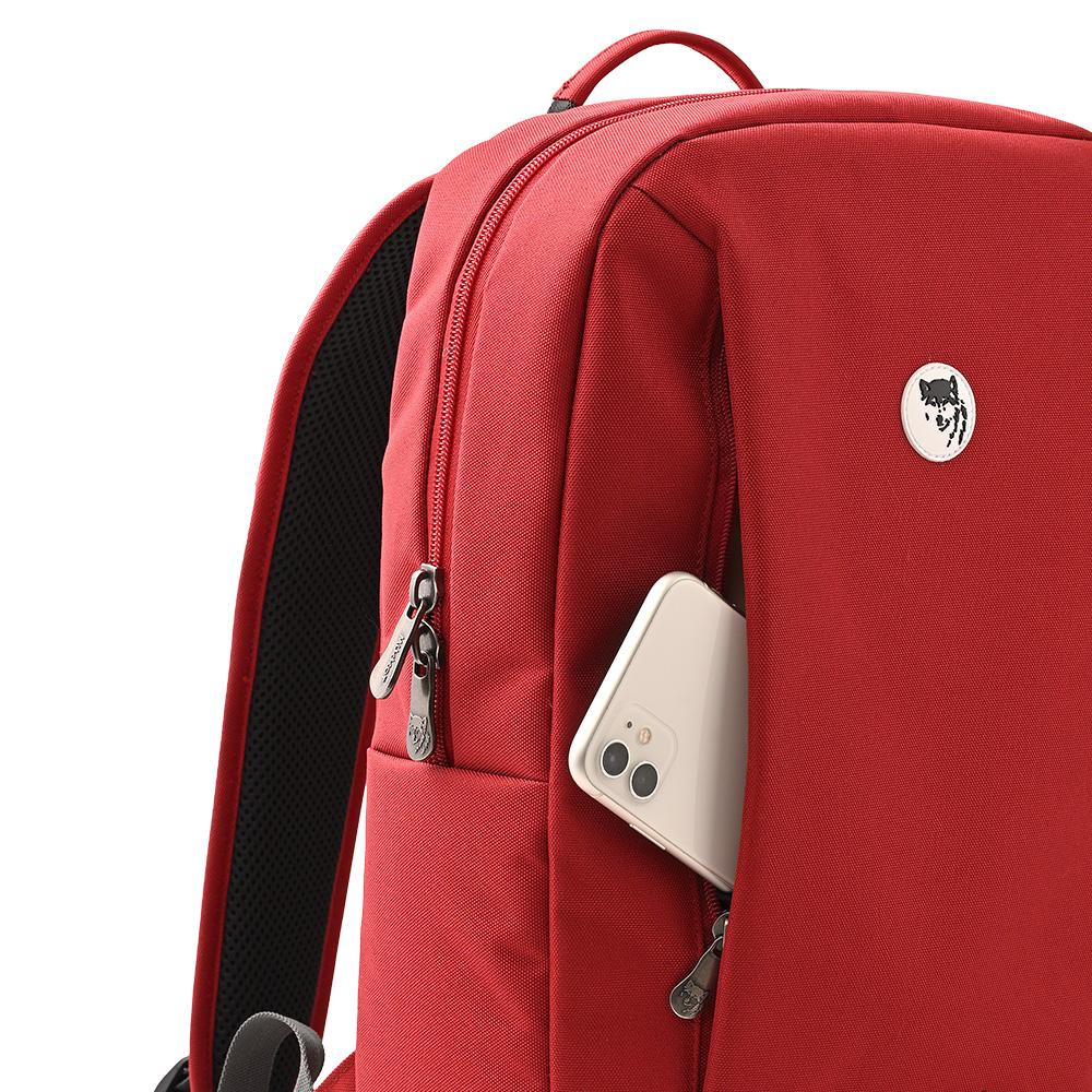 - Mặt trước balo đính logo chú sói biểu tượng thương hiệu và logo hợp kim MIKKOR nổi bật.
