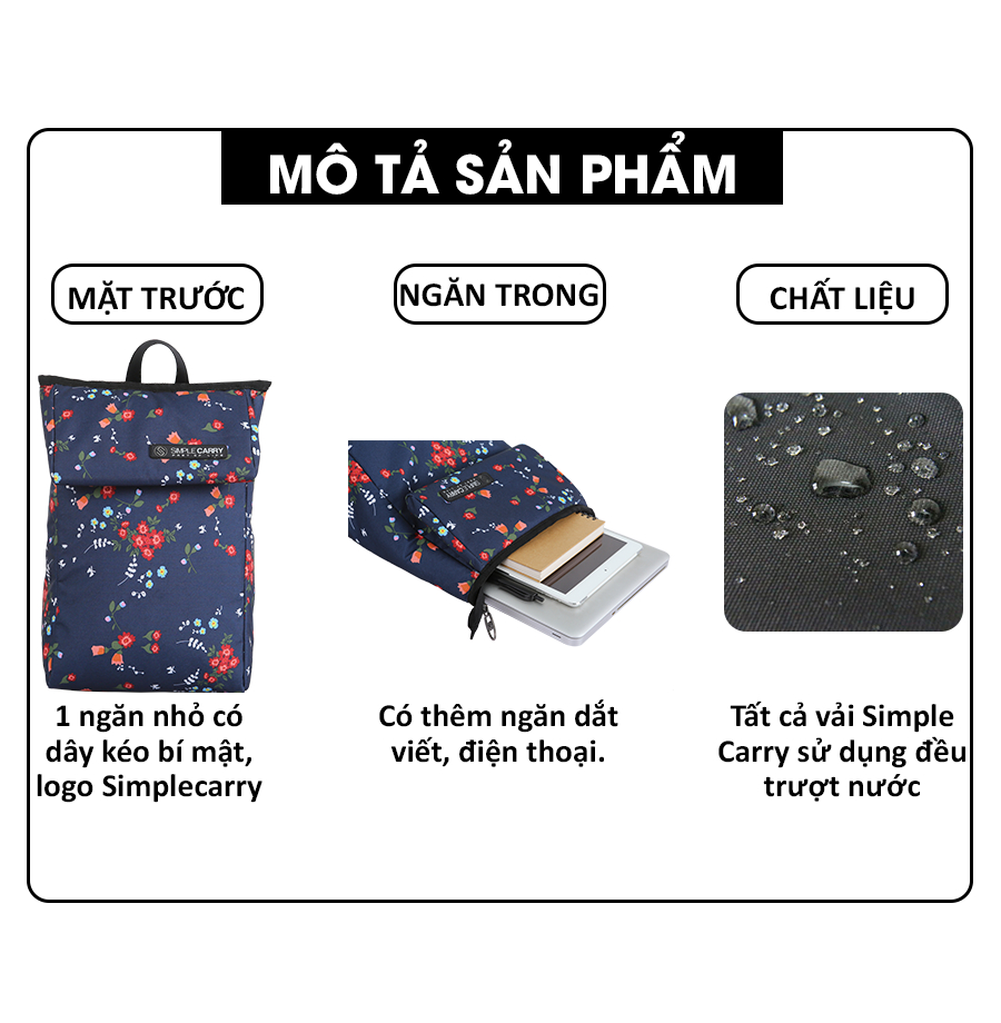 - Mặt trước 1 ngăn nhỏ có dây kéo bí mật, may logo Simplecarry.