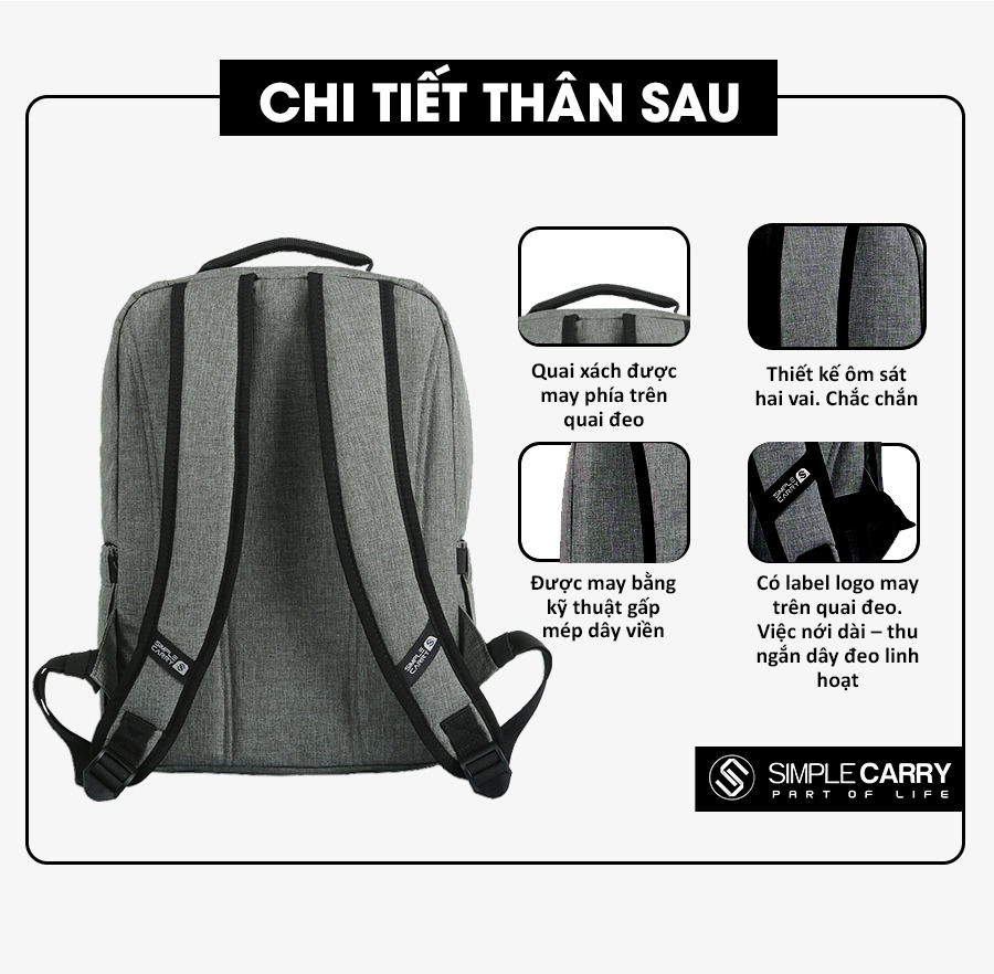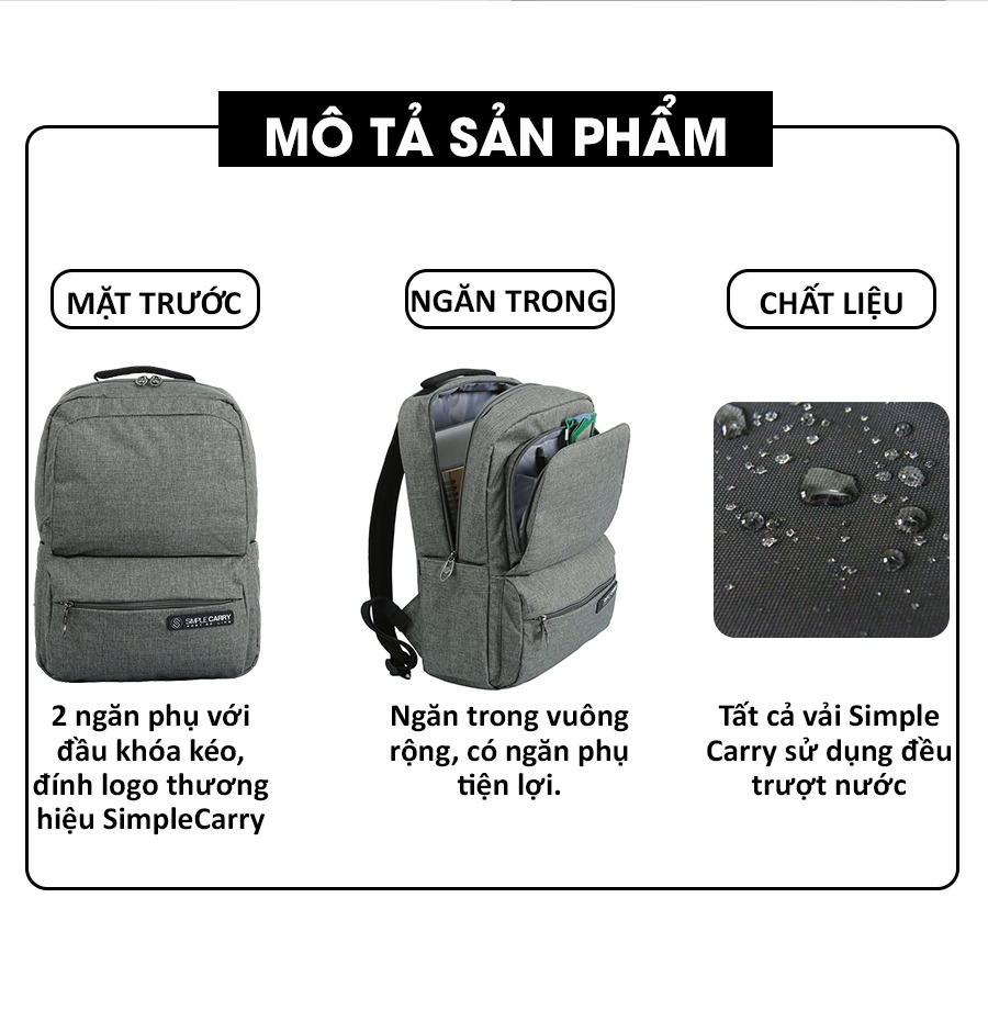 - Mặt trước có 2 ngăn phụ với đầu khóa kéo đính logo thương hiệu Simplecarry