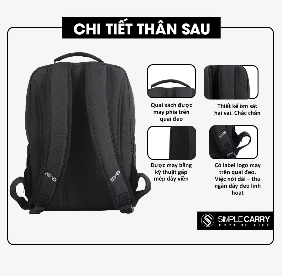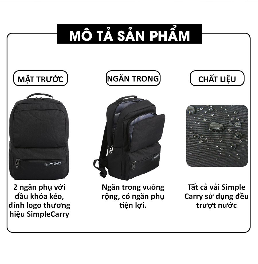 - Mặt trước có 2 ngăn phụ với đầu khóa kéo đính logo thương hiệu Simplecarry