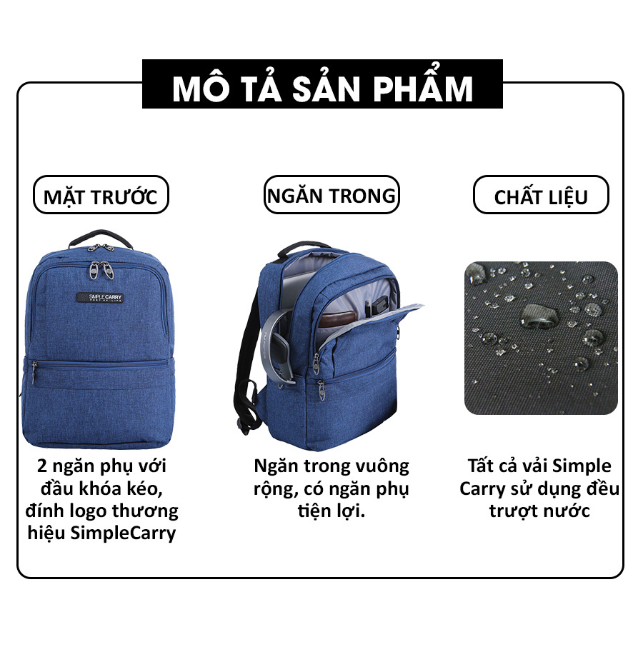 - Mặt trước có 2 ngăn phụ với đầu khóa kéo đính logo thương hiệu Simplecarry