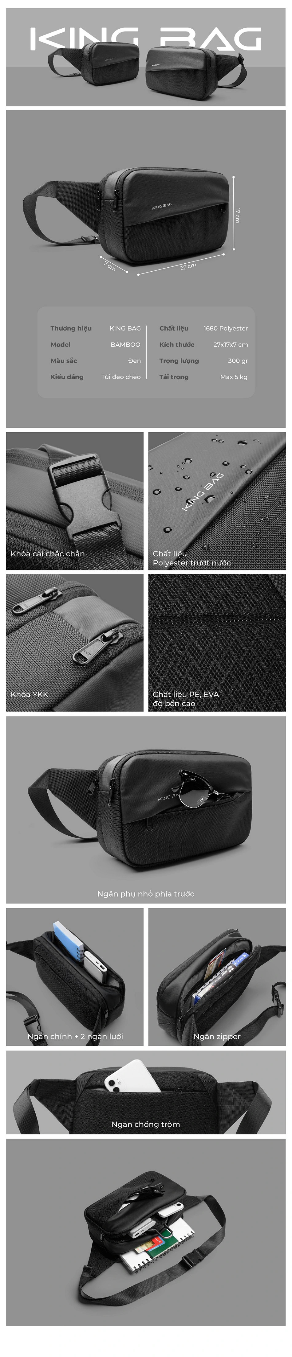 - Túi đeo chéo Kingbag Bamboo được với kiểu dáng sang trọng, thời trang nhiều ngăn tiện dụng phù hợp cho cả nam và nữ.