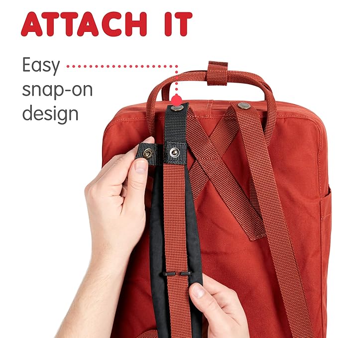 - Đệm thêm cho dây đeo vai rộng của Kanken giúp bạn thoải mái hơn khi mang vác vật nặng. Gắn bằng nút bấm và kẹp ở giữa giúp giữ dây đeo đúng vị trí.
