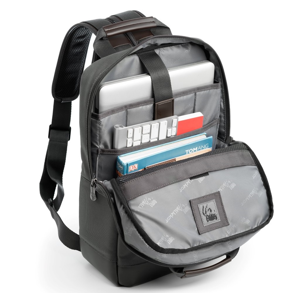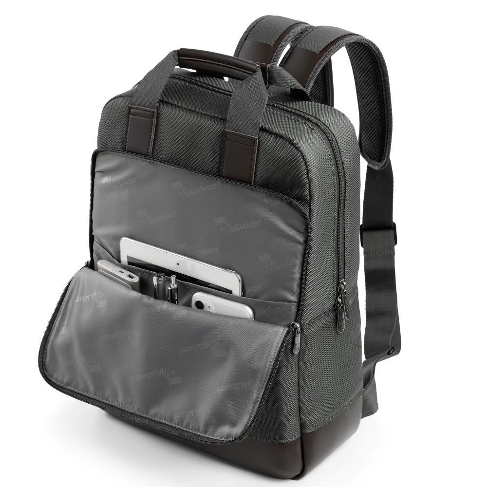 - Balo Mikkor thiết kế với form vuông gồm 1 ngăn chính bên trong có ngăn laptop 17 inch, ngăn để tài liệu và 1 ngăn lưới đựng phụ kiện.
