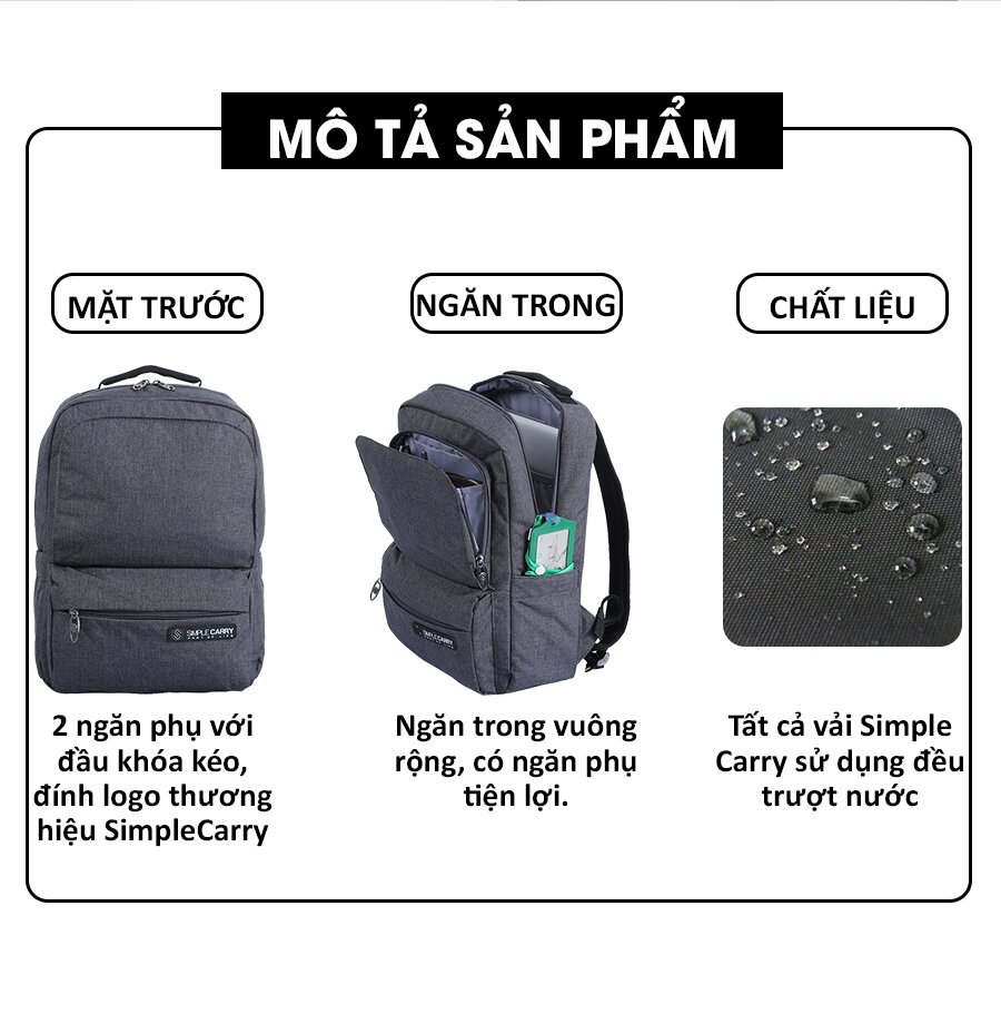 - Mặt trước có 2 ngăn phụ với đầu khóa kéo đính logo thương hiệu Simplecarry