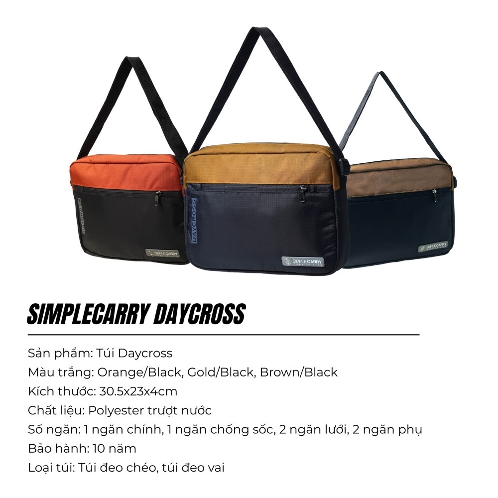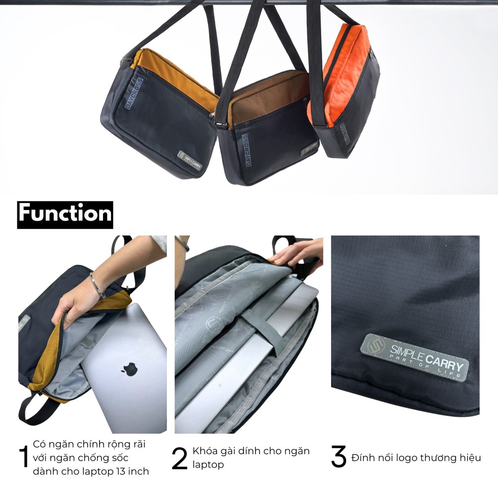 - Túi đeo chéo Simplecarry Daycross thiết kế thời trang, gọn nhẹ, tiện dụng để được laptop 13 inch và các phụ kiện thường hay sử dụng hàng ngày.