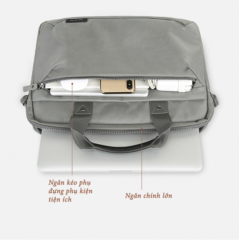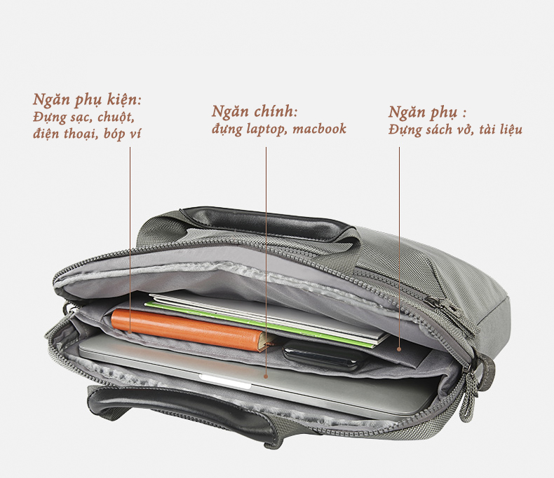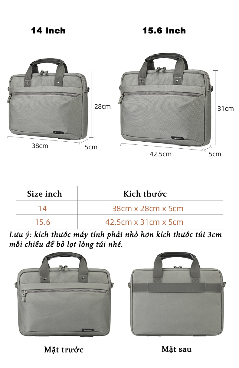 - Ngăn chính dành cho laptop 14" hay 15.6" , ngăn phụ để sách vở, tài liệu... và ngăn phụ kiện để sạc, chuột, điện thoại.